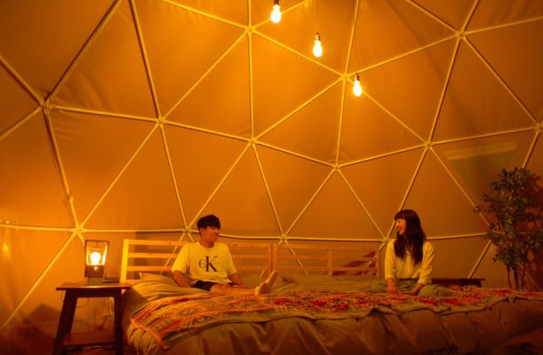 本格的なグランピングを森の中のプライベートサイトで楽しめる「グランピングドーム1」は、冷暖房完備のドーム型テントで一年中快適な滞在が可能です。アンティーク調の家具が置かれたおしゃれな空間で、都会の喧騒を離れてゆったりとした時間を過ごせます。
